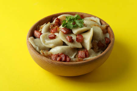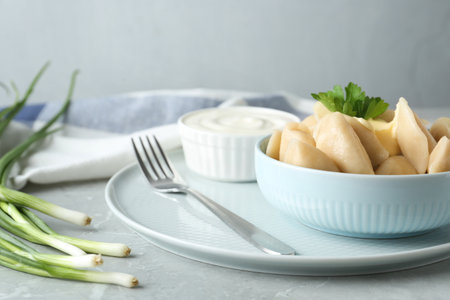 Traditional ukrainian dish vareniki served in a bowl with sour cream. Close up view of traditional Ukrainian food