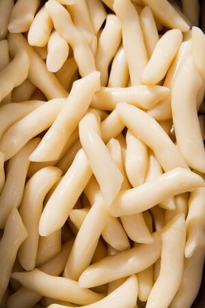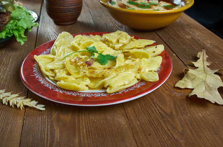 National meal of Slovakia - bryndzove halusky. Boiled lumps of potato dough with a soft sheep cheese