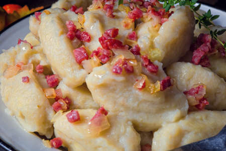 Traditional Slovak food - Bryndzove pyrohy with bacon on plate. Sheep cheese dumplings with bacon and sour cream The food in the restaurant. Food styling and restaurant meal serving.