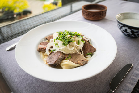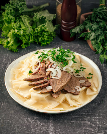 Composition of tasty Kazakh national dish beshbarmak in a plate with kazy, flour tortillas, onions on a table in a restaurant