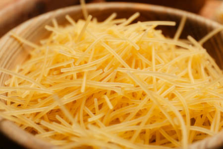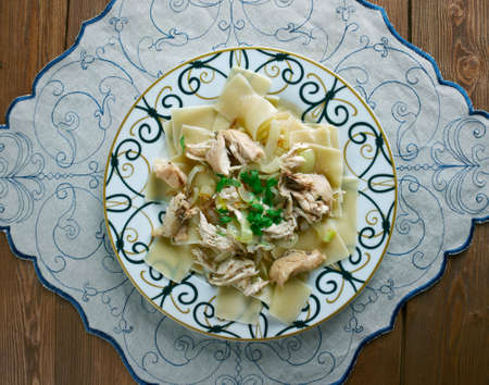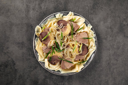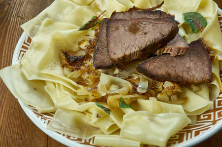 Besh barmak, boiled meat is finely chopped with knives, mixed with boiled noodles. Typically, Kyrgyz cuisine, Traditional assorted dishes, Top view.