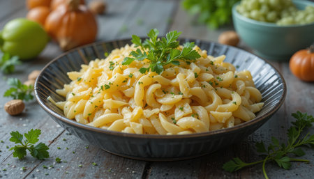 Macaroni with cheese and herbs in a rustic style. Selective focus.