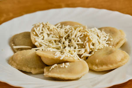 Dumplings, filled with mashed potatoes. Russian, Ukrainian or Polish dish: varenyky, vareniki, pierogi, pyrohy.