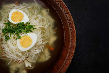 Chicken broth, with vermicelli, herbs and egg, on a dark background
