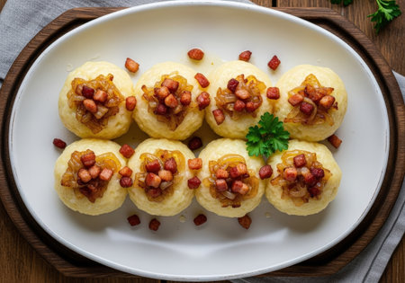 A top-down view of delicious Polish pyzy. These traditional potato dumplings are served on a plate, topped with crispy fried bacon and onions.
