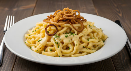 A white plate holds a generous serving of Kasespatzle, a traditional German egg noodle dish, covered in melted cheese sauce and topped with crispy fried onions and fresh parsley. The comfort food is served on a wooden table with a fork and knife.