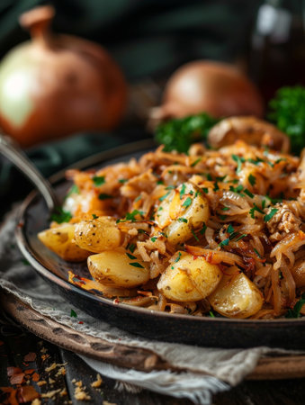 Portion of the sliced traditional czech potato dumplings stuffed with smoked meat, braised cabbage and fried onion.