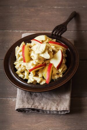 Tasty homemade czech food chicken on paprika - chicken in pepper sauce with dumplings on white plate on wooden table with serving
