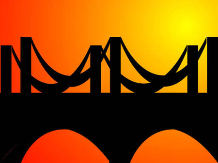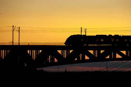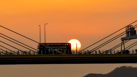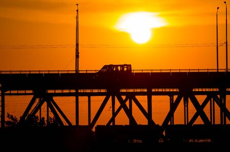City bus silhouette crossing the bridge in sunset, public transportation.