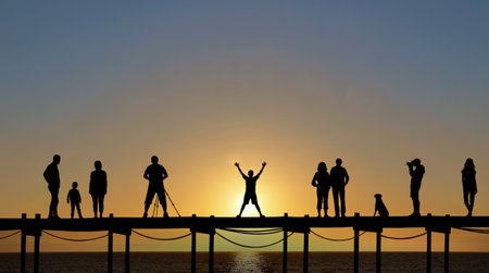 People come together to admire the splendor of the setting sun, young boy with his hands held high, embracing the magical moment