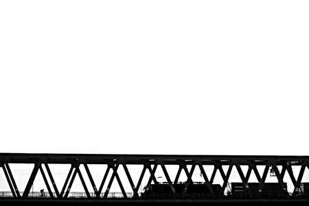 The silhouette and the outline of a railway bridge with a train and cyclists.