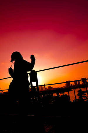 Silhouette of one woman use cellphone and walking on the stairway in sunset.
