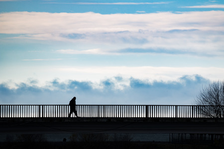 Person walking on modern architecture metal bridge in silhouette in evening dusk light.
