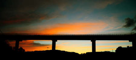 The sunset and the silhouette of the bridge piers. Zhongxing Bridge spans the Tamsui River and connects two cities. Taipei City.