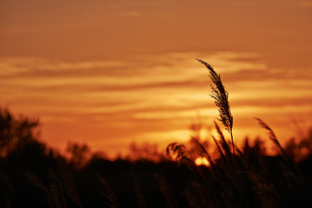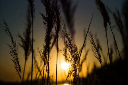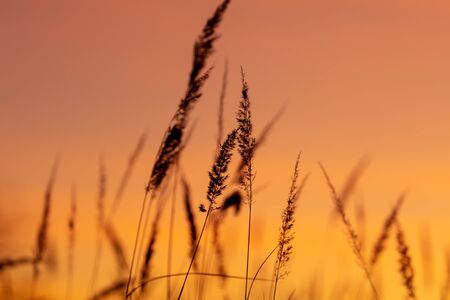 Closeup on reed grass ears against sundown, sunset abstract background