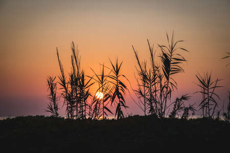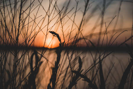 A beautiful sunset silhouette scene with grasses growing on the beach. Summer evening in Latvia, Europe.