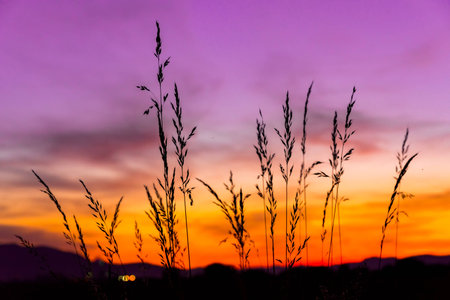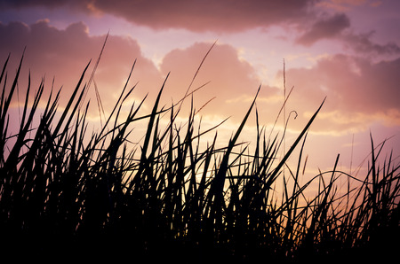 Beautiful sunset back lighting through dry plants with twilight sky