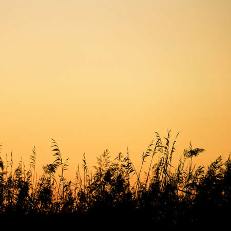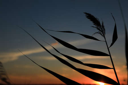 Silhouette of a reed in the evening at sunset at dusk