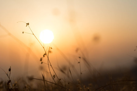 Silhouette of grass on sky in the Background.The rising sun with a grass.Thailand
