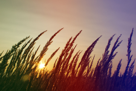 Beautiful scene with waving wild grass on a sunset. Grass at sunset. Retro style.