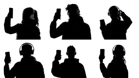 Person with Headphones Taking a Selfie Silhouettes isolated on plain white background.