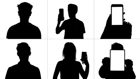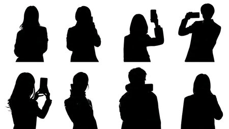 Back to Camera Scene Selfie Silhouettes isolated on plain white background.