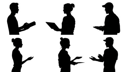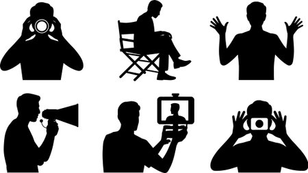 A collection of silhouette icons depicting people using technology, communicating, and directing. Includes photography, video recording, public speaking, and general interaction.