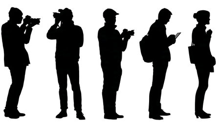 Black Solid Camera Shop Salesman Silhouettes Set of Six on White Background isolated on plain white background.