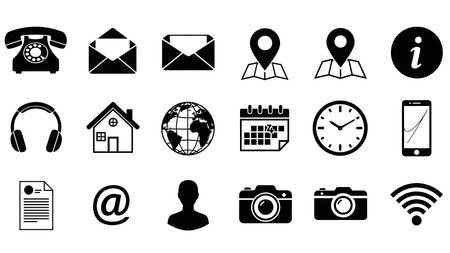 Set of communication icons. Phone, mobile phone, retro phone, location, mail and web site symbols on isolated background for applications, web, app. EPS 10 vector