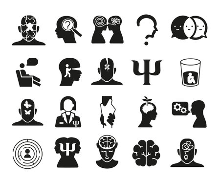 Psychology icons. Set of 20 psychology trendy minimal icons. Brain, Therapist, Depression, Support, Counseling icon. Design signs for web page, mobile app, packaging design. Vector illustration.