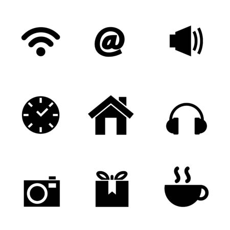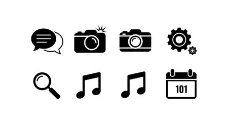 This vector artwork presents a clean set of communication and multimedia icons including camera, music, magnifier, gear, and calendar, offering clarity and simplicity. Calm mood.