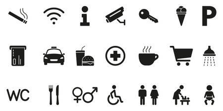 Public Facility And Service Solid Icon Set. Comprehensive Collection Of Symbols For Amenities, Navigation and Accessibility Silhouette Symbol Collection. Isolated Vector