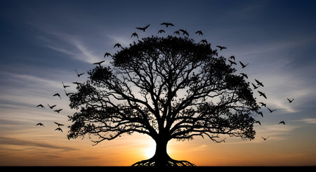 A silhouette of a large tree dominates the scene, set against a stunning backdrop of a sunset. The sky displays a gradient of orange and red hues. The composition is a low-angle shot, providing a dramatic view. This image is suitable for various editorial and commercial applications.