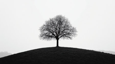 A solitary tree stands on a hill, its dark silhouette contrasting against a pale sky, creating a serene, minimalist depiction of nature at sunset.