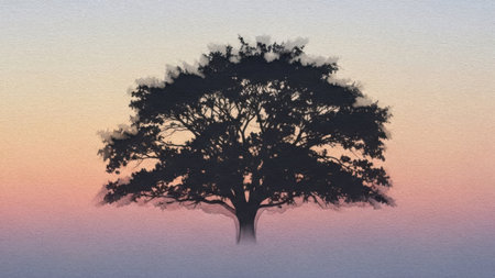 A silhouette of a lone tree with a sprawling canopy, set against a dramatic, stormy sky, emphasizing the strength and solitude of the tree in the landscape.