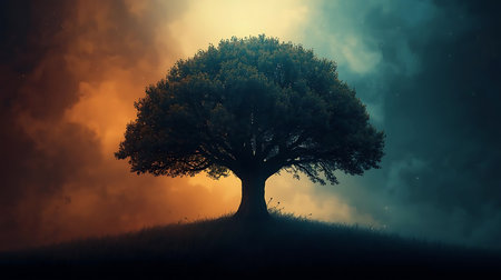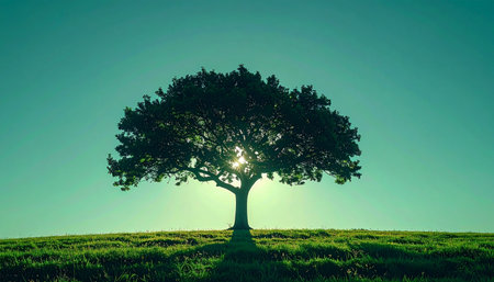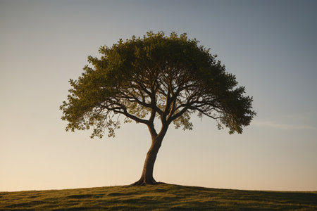 A majestic, solitary tree stands strong on a grassy hill, its silhouette a symbol of life and resilience. The morning sun peeks through its branches, casting a hopeful glow and heralding a new day filled with peace, growth, and quiet strength.