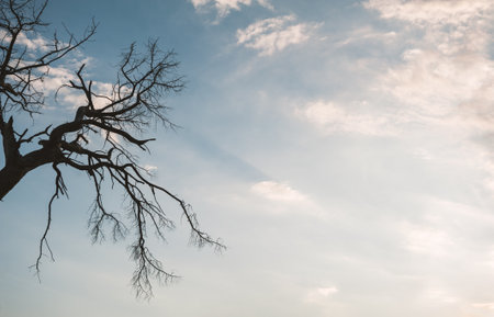 Dry tree stands alone against a pale cloudy blue sky, its brittle branches creating a dramatic silhouette