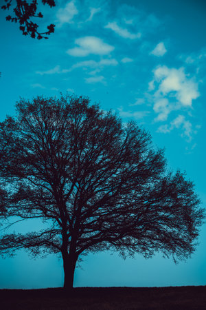 Silhouettes of bare trees against a blue sky in the cold season. Autumn nature of the park, forest. Vertical backdrop. Gloomy spooky old branchy tree.