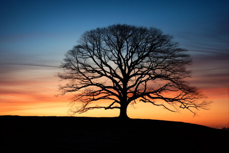 A majestic tree stands alone on a hill, its branches bare and silhouetted against a breathtaking sunset. The sky is ablaze with hues of orange, pink, and purple, creating a serene and peaceful atmosphere.