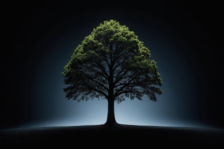 A single, majestic tree stands as a dark silhouette against a serene, green-tinted sky. Bathed in the soft glow of a hidden sun, this tranquil scene on a grassy hill evokes feelings of peace, solitude, and enduring strength in nature.