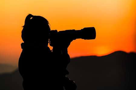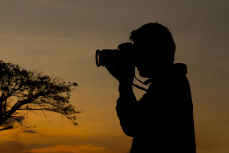 Silhouette of a photographer like to travel and photography, taking pictures of the beautiful moments during the sunset ,sunrise