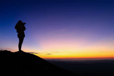 Silhouette of woman taking photograph on the top of mountain and enjoy colourful sky.