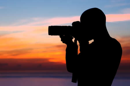 Photographer taking pictures, silhouette of a man with camera over beautiful orange sunset background, photographing amazing view of a nature near the beach
