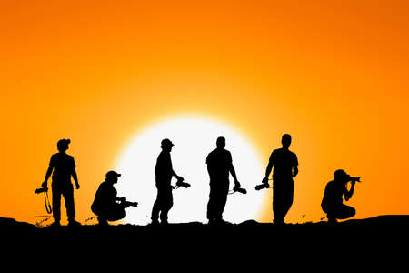 Silhouette of a professional landscape travel photographer holding a camera on a mountain. Silhouettes of many professional photographers posture in the evening