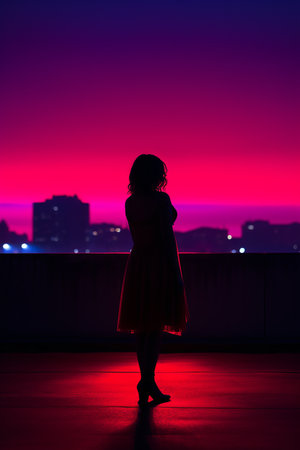Silhouette of a young man standing on a rooftop at sunset, admiring the cityscape and colorful clouds