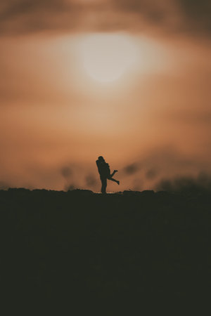 Silhouettes of old man and woman that tenderly embrace in the nature