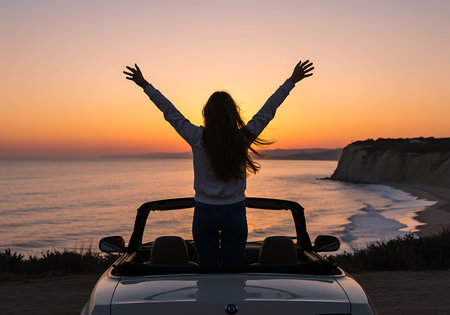 Silhouette of a woman with arms outstretched, enjoying a vibrant sunset while standing in an open-top convertible car by the coast. Generative Ai