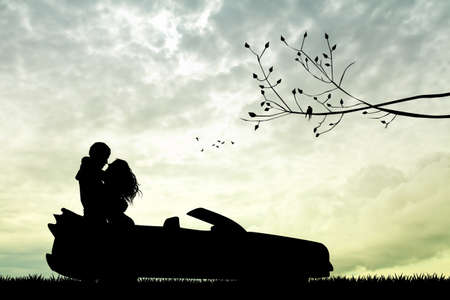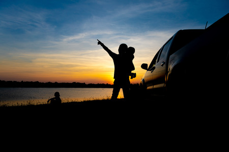 Silhouette of happiness couple stay near the new car under sky