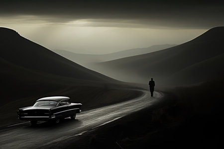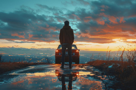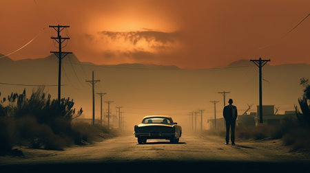An image captures a silhouetted figure standing near a vehicle. Warm orange and yellow hues dominate the background, suggesting a sunset or sunrise. The scene features atmospheric effects, creating a textured backdrop. This composition could be suitable for various commercial or editorial applications.