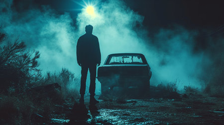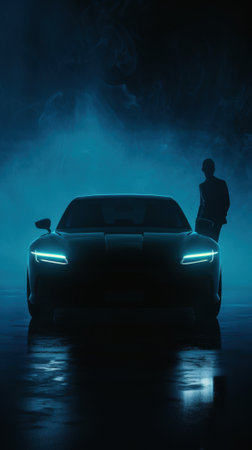 Silhouette of man beside sports car with headlights illuminated in neon blue mist.